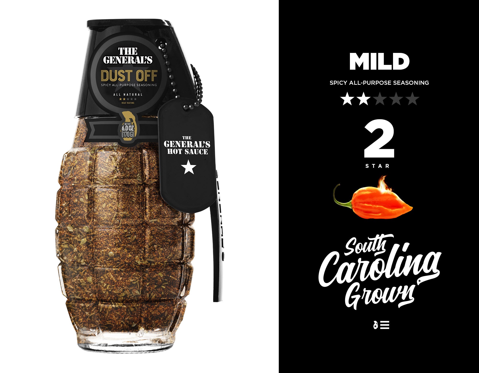 A mild, all-purpose seasoning with a spicy kick. A savory blend of sea salt, spices, and 100% American-grown sun-dried habanero mash. Whether grilling steaks, roasting veggies, or making a mean pot of mac 'n cheese - Dust Off's mission is to obliterate blandness.